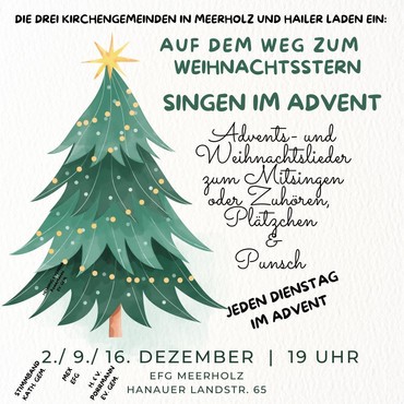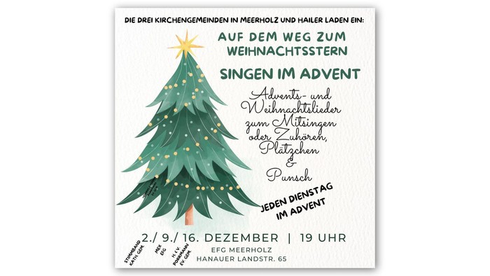 Unter dem Motto „Auf dem Weg zum Weihnachtsstern“ laden die drei Kirchengemeinden in Meerholz und Hailer an den Adventsdienstagen (2., 9. und 16. Dezember) um 19 Uhr herzlich zum gemeinsamen Singen ein. In der EFG Meerholz, Hanauer Landstraße 65, erklingen vertraute Advents- und Weihnachtslieder – mal besinnlich, mal beschwingt, aber immer mit Herz. Wer mag, singt aus voller Kehle mit, wer lieber zuhört, genießt einfach Plätzchen, Punsch und Atmosphäre. Das Ganze ist ein fröhliches Miteinander von Jung und Alt – eine musikalische Verschnaufpause auf dem Weg zum Fest. Stimm dich ein, bring deine Lieblingsstimme mit – und folg dem Weihnachtsstern!