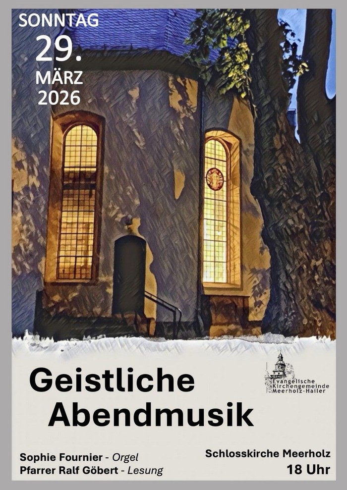 Am Sonntag, dem 29. März 2026, lädt unsere Gemeinde zur inzwischen 20. Geistlichen Abendmusik in die Schlosskirche Meerholz ein. Diese Reihe ist für viele zu einem festen Bestandteil des Gemeindelebens geworden – ein Ort der Besinnung, der Musik und der geistlichen Begegnung.