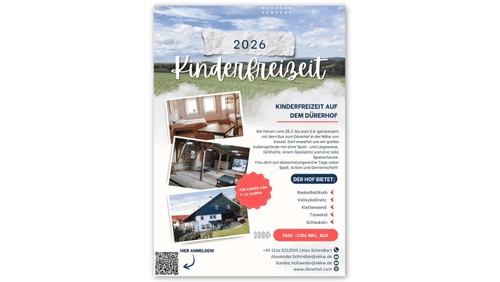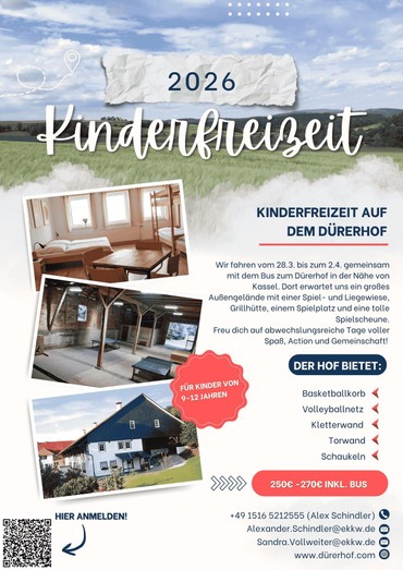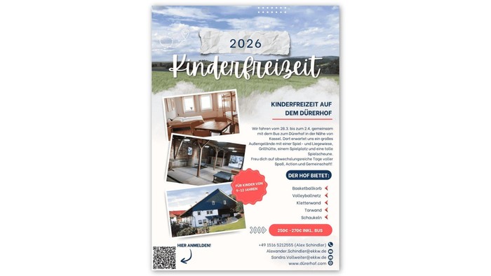 Ende März geht es gemeinsam mit dem Bus zum Dürerhof bei Kassel, wo große Wiesen, eine Spielscheune und viele Möglichkeiten für Bewegung und Entspannung warten. Der Hof bietet Basketballkorb, Volleyballnetz, Kletterwand, Torwand und Schaukeln – genug Raum für Action und neue Freundschaften. Grillhütte, Spielplatz und helle Zimmer sorgen dafür, dass sich alle schnell zuhause fühlen. Die Tage sind abwechslungsreich gestaltet und verbinden Spiel, kleine Aktionen und gemeinsame Erlebnisse. Eine Freizeit, die Kindern Zeit zum Austoben gibt und zugleich Momente schafft, die lange in Erinnerung bleiben. Die Teilnahme kostet 250–270 € inkl. Busfahrt. Anmeldung hier: https://forms.churchdesk.com/f...