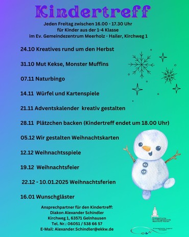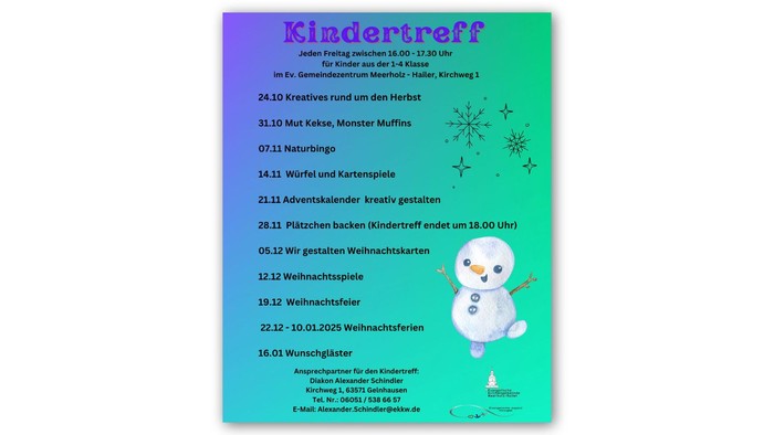 Immer freitags von 16 bis 17:30 Uhr treffen sich Grundschulkinder im Gemeindezentrum Meerholz-Hailer, um kreativ zu werden, zu spielen und gemeinsam durch die Jahreszeiten zu toben. Ob beim Naturbingo, beim Plätzchenbacken oder bei lustigen Weihnachtsspielen – hier ist Abwechslung garantiert. Wenn die Adventszeit anbricht, funkeln die Augen beim Adventskalender-Basteln und der großen Weihnachtsfeier am 19. Dezember. Nach einer kurzen Pause über die Feiertage geht’s im Januar mit neuen Ideen weiter – los geht’s am 16. Januar mit Wunschgläsern. Einfach kommen, mitmachen, Spaß haben – hier ist Platz für jedes Kind!