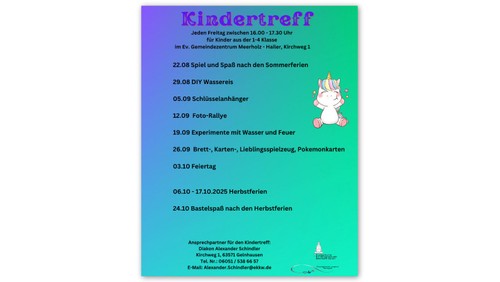 Auch der Kindertreff geht nach den Ferien wieder los! Jeden Freitag von 16 bis 17.30 Uhr treffen sich Kinder der 1. bis 4. Klasse im Gemeindezentrum Meerholz-Hailer. Auf die Kids warten viele abwechslungsreiche Aktionen: vom Basteln und Spielen über Experimente bis hin zu einer Foto-Rallye. Auch eigene Lieblingsspiele oder Karten können einmal mitgebracht werden. Einfach vorbeikommen und gemeinsam einen bunten Nachmittag voller Spaß erleben!
