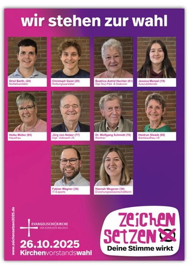Am 26. Oktober 2025 wählt unsere Kirchengemeinde einen neuen Kirchenvorstand. Zehn engagierte Kandidatinnen und Kandidaten stellen sich zur Wahl und bringen ganz unterschiedliche Erfahrungen und Begabungen mit – von jung bis erfahren, von IT bis Pädagogik, von Rettungsdienst bis Gemeindearbeit. Deine Stimme entscheidet, wer in den kommenden Jahren die Arbeit unserer Gemeinde leitet und prägt. Besonders praktisch: Die Wahl kann auch online durchgeführt werden – einfach, sicher und bequem von zuhause aus. So kannst du mit wenigen Klicks ein Zeichen setzen und die Zukunft der Gemeinde aktiv mitgestalten. Nutze die Chance und mach deine Stimme stark! Hier geht es direkt zur Online-Wahl. Du brauchst nur deine Wahlbenachrichtigung. Hier gibt es weitere Infos!