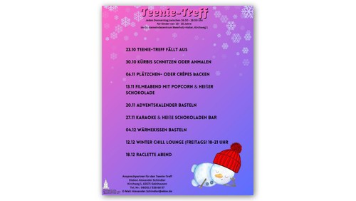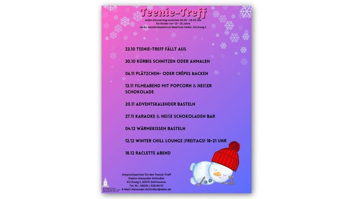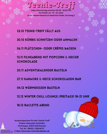 Jeden Donnerstag von 16 bis 18 Uhr treffen sich im Gemeindezentrum Meerholz-Hailer Kids und Teens zwischen 10 und 15 Jahren, um zusammen zu lachen, basteln, kochen oder einfach abzuhängen. Von Kürbisschnitzen über Crêpes-Backen bis zum Filmabend mit Popcorn ist alles dabei. Im Advent wird’s gemütlich: Wir basteln Wärmekissen, singen bei der Karaoke-Bar und chillen in der Winter Lounge am 12. Dezember. Zum Finale wartet ein geselliger Raclette-Abend am 18. Dezember. Einfach vorbeikommen, reinschnuppern, mitmachen – Spaßfaktor garantiert!
