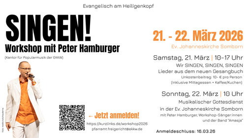 Am Sonntag, 22. März, gestalten wir gemeinsam mit den Workshop-Teilnehmenden, mit unserer Kirchenband Amasja und Peter Hamburger um 10 Uhr einen musikalischen Abendmahlsgottesdienst zum geplanten neuen Evangelischen Gesangbuch. Wir freuen uns über eure Anmeldungen!